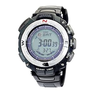 Perfect for rugged adventurers and weekend warriors, the solar-powered Casio Pathfinder men's sport watch is loaded with a digital compass and altimeter/barometer/thermometer--perfect for both mountain trekking and cave spelunking. It also includes tide and moon graphs and moon age data, and is very precise thanks to its atomic timekeeping features. The altimeter offers 5-meter measurements from -700 to 10,000 meters, and it can store altitude, month, date and time data, provide tendency and differential graphs, track cumulative ascent/descent, and sound an alarm when you reach a specified altitude. The watch also has a digital compass with 16 points of measurement displayed on the dial face. Other environmental and timekeeping features include: Barometer with atmospheric pressure tendency/differential graphics Thermometer World Time: 29 times zones (30 cities), city code display, daylight saving on/off 5 daily alarms 1/100 second stopwatch with 24-hour capacity and elapsed/split time modes and 1st-2nd place times Countdown timer with 60-minute range Auto Calendar (pre-programmed until the year 2099) This watch also features a ±20-second accuracy per month, Afterglow backlighting, and water resistance to water resistance to 200 meters (660 feet)--which will stand up to the rigors of recreational scuba diving. This solar-powered watch has a battery life of up to 5 months on a full charge (without further exposure to light). This multi-band radio-controlled watch receives a time calibration signal transmitted from several locations across the globe (the U.S., UK, Germany, and Japan), and it has an auto receive function (up to 6 times per day). You can choose to automatically receive this signal four times a day, or manually update the watch to the atomic clock.